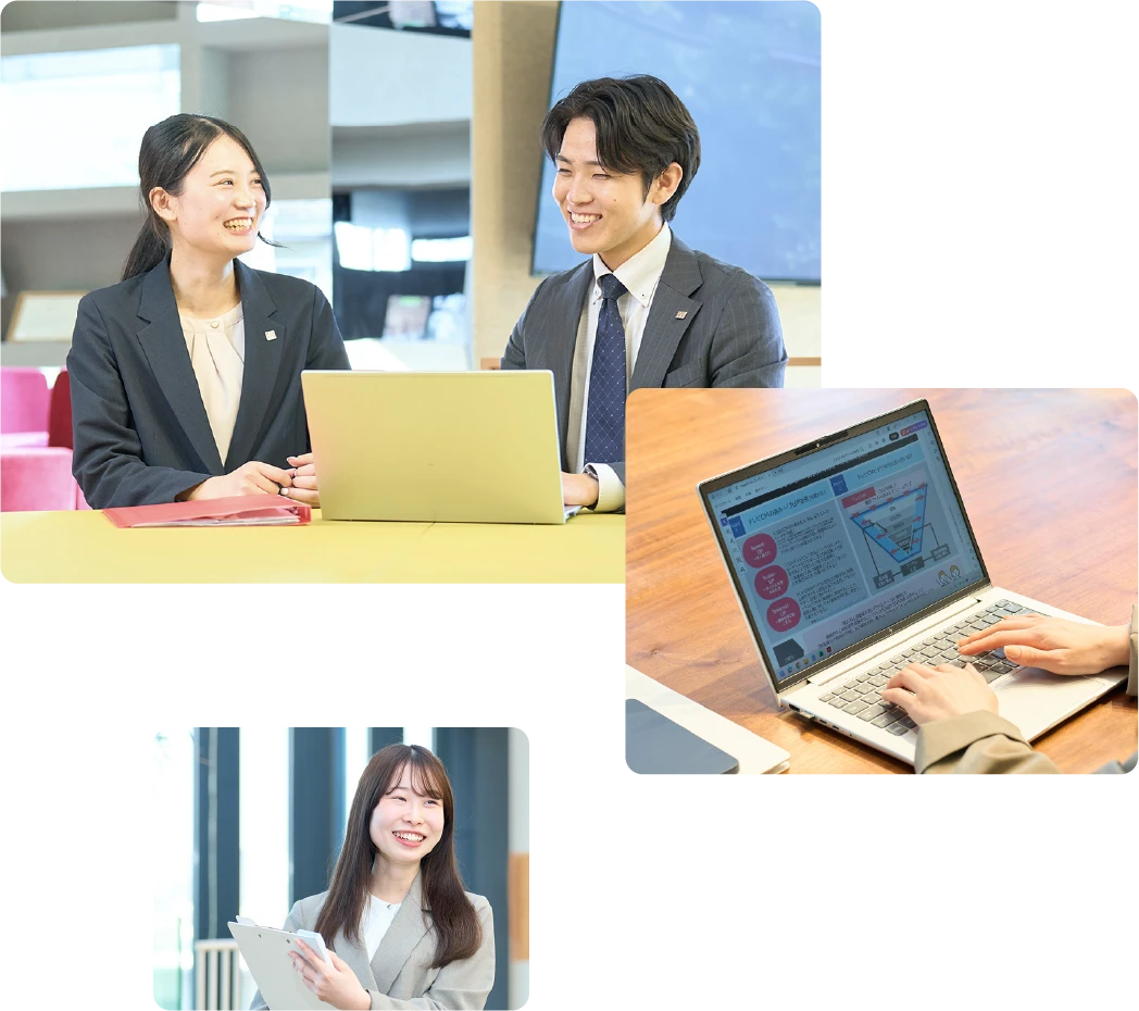 ワークショップ形式でのアイデア創出や、オウンドメディア開発、デジタル施策の戦略立案・運用などを組み合わせ、各クライアントのニーズに合わせた柔軟なソリューションを提供します。また、弊社社員は一般社団法人ウェブ解析士協会 (WACA )が認定するウェブ解析士の資格を取得しており、分析ツールを用いた分析スキルも身に着けています。